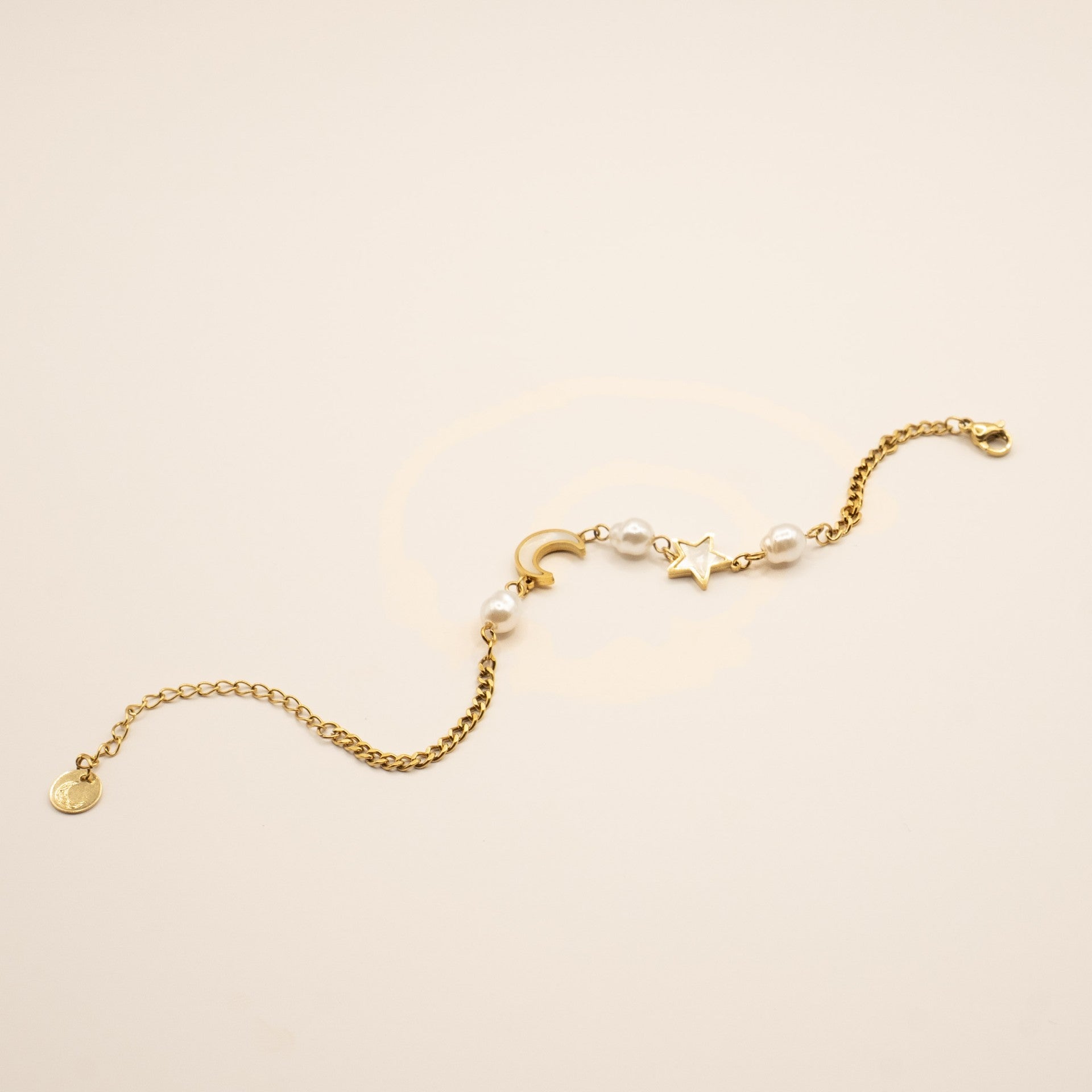 Selestia is a delicate yet radiant bracelet featuring a golden crescent moon, a luminous star, and natural pearls that float in between. Each element symbolizes light, intuition, and cosmic guidance — a constellation created to align with your inner rhythm.
